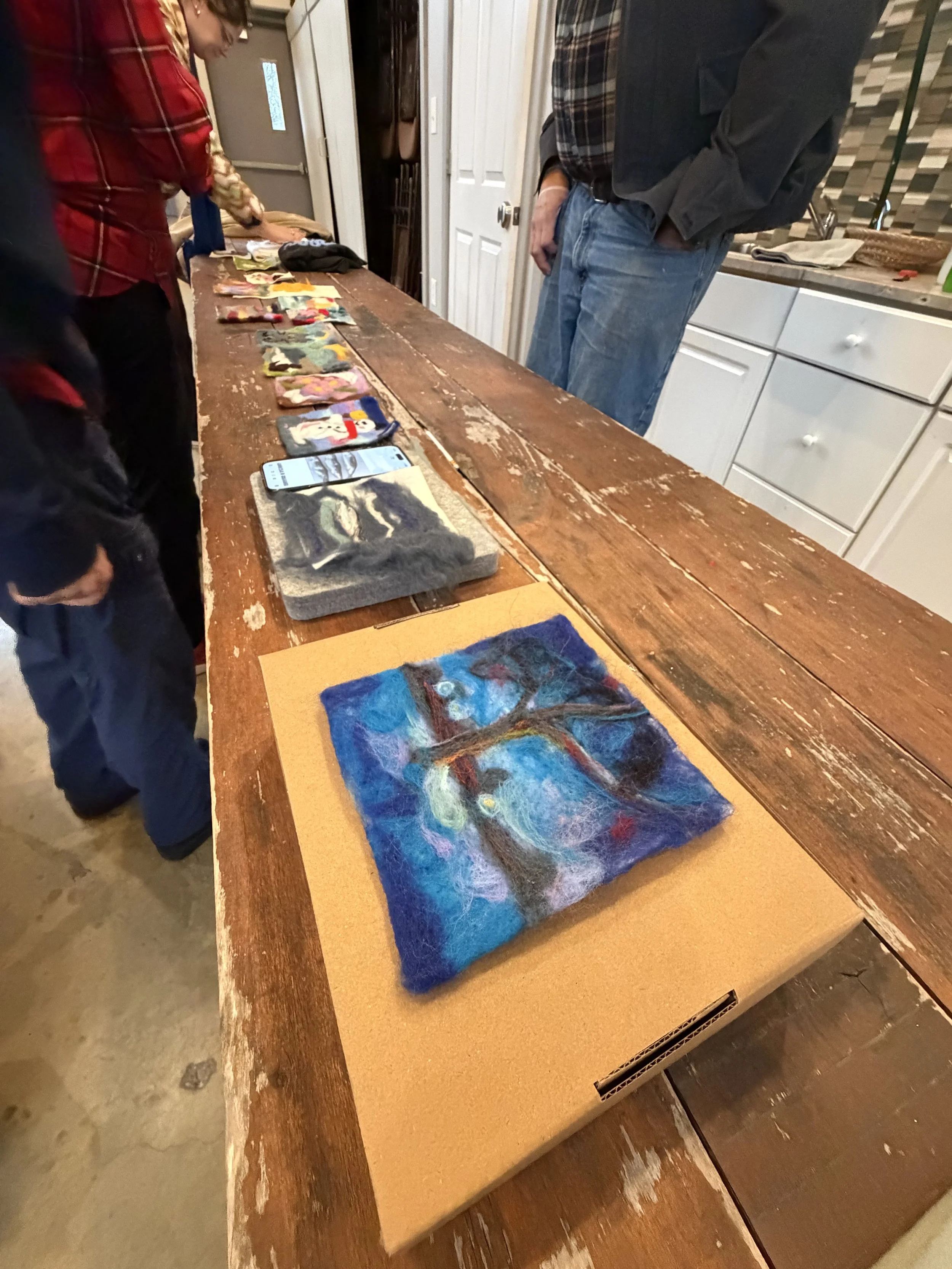Artist Katrina Mullins led this popular wool felting workshop where participants learned to felt colorful wool fibers onto a garment or a provided wool square. This fun technique made it possible for them to add their own original design or incorporate something beautiful from the provided templates for an arty and functional result.